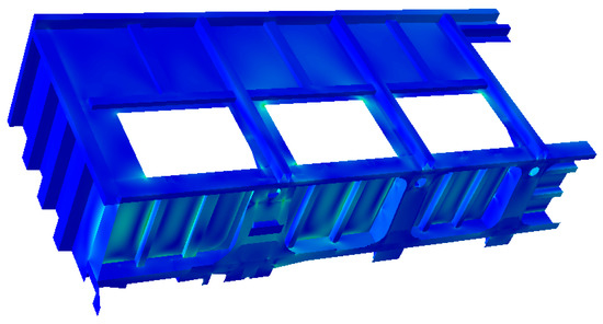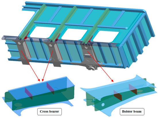 In general, the gondola car body is welded with weathering steel Q450NQR1, and the study [21] gives structure introduction in detail. The car body includes two key types of box girders, which are the bolster beam and cross bearer. The 1/4 car body is shown in Figure 3.
