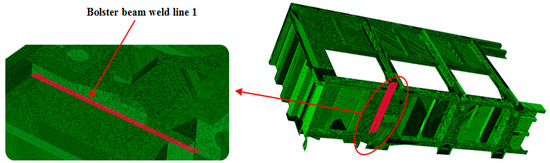 The thickness of each plate is much smaller than the length, width, and height of the car body, so we can use shell elements for finite element simulation by Abaqus software. The mesh model is shown in Figure 5 and the weld line 1 is marked. The mesh is refined on a local part that connects with the bolster beam, and the model has 1,250,555 nodes and 1,262,507 units.