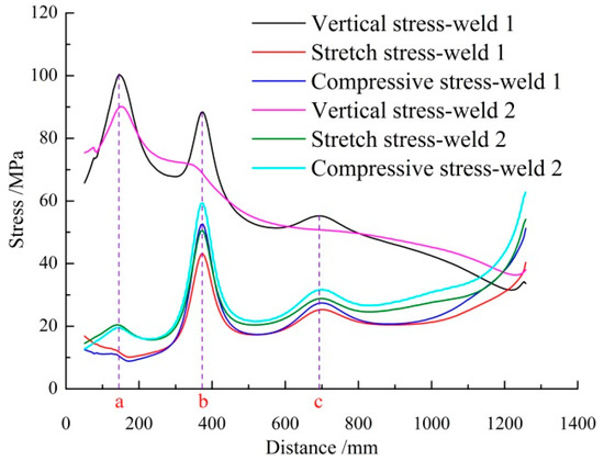 - During vertical loading, the stress of weld 1 is higher than that of weld 2, and the stress of the two welds decreases gradually with the increase of distance. During stretch loading and compressive loading, the stress change trend is gentle and the upward trend except at 500 mm, and the stress is slightly fluctuated away from partition 1; the stress of weld 2 is higher than that of weld 1.