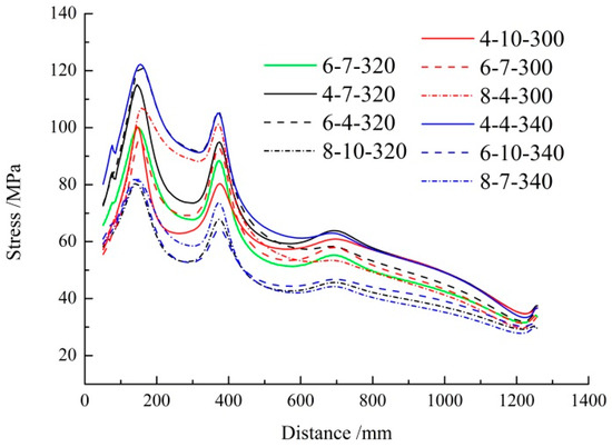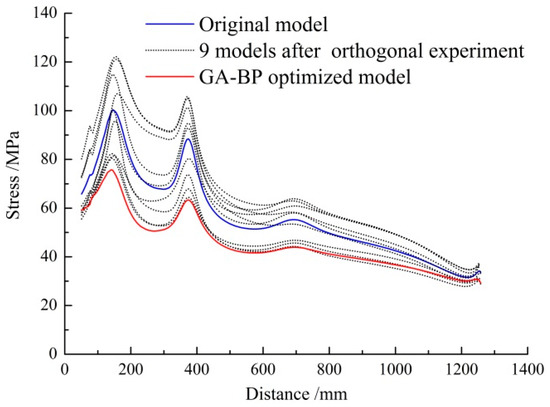 According to the optimization parameters, the new finite element model is established. In order to be clear, visible, and convenient for comparative analysis, this stress distribution curve is plotted in Figure 10, which is shown together with the curve in Figure 8. We can see that the optimized model is minimal at 150 mm, which is shown in Table 3, and the stress on the entire weld is less than other models. This result shows that the GA-BP method is reasonable and feasible in the box girder optimization of the gondola car body.