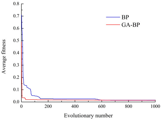 Firstly, according to the data from Table 2, we can use them as the training samples for BP neural networks, and they are normalized. Secondly, the three-layer neural network is created by the newff() function in the MATLAB toolbox, in which three input neurons, seven hidden layer neurons, one output neuron, and the mean variance target is 10−3. Thirdly, the GA method is used to further optimize the data. The initial population size is 50 and the number of iterations is 1000, which were coded with real numbers and new individuals were selected with the roulette method. In addition, in order to compare and analyze the convergence effect of method GA-BP, the data in Table 2 are also trained by the BP algorithm. The two average fitness curves are shown in Figure 9. We can clearly see from Figure 9 that the convergence speed by BP-GA algorithm is faster, and the efficiency is higher. The best fitness value is found after about 650 generations by BP-GA algorithm, in other words, the optimal solution is found, and the optimization results are listed in Table 3.