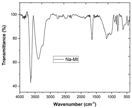 From FTIR analysis (Figure 1) [], Na-Mt exhibits the stretching vibration of structural O–H groups at 3645 cm−1, structural Si–O groups at 1103, 999 and 789 cm−1, structural Al–O–Al–OH groups at 902 cm−1, structural Al–O–Fe–OH groups at 883 cm−1, the free and interlayer water in bond stretching vibration at 3396 cm−1 and adsorbed water yielded bending at 1643 cm−1 [,,,].
