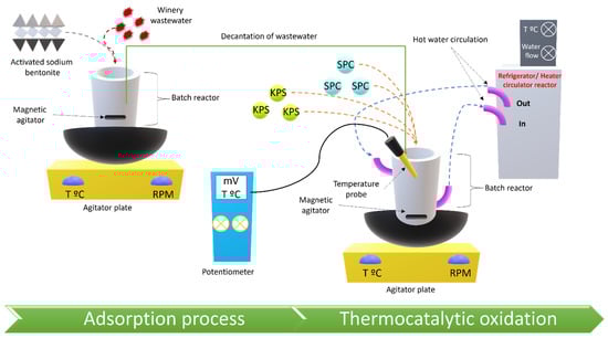 Activated sodium Bentonite (Na-Mt) was purchased by Angelo Coimbra & Ca., Lda (Maia, Portugal), sodium percarbonate (SPC, Na2CO3•1.5H2O2) by Alfa Aesar (Massachusetts, EUA) and persulfate or potassium peroxydisulfate (KPS, K2S2O8), by Scharlau (Sentmenat, Barcelona, Spain). NaOH and H2SO4 (95%) were acquired by Analar Normapur (Vila Nova de Gaia, Portugal). Deionized water was used to prepare the respective solutions. The WW was collected from a private Portuguese cellar unity located in the Douro region (Northeast of Portugal). The WW samples were stored at −40 °C, and the work was performed at the University of Trás-os-Montes and Alto Douro, located in Vila Real, Portugal, latitude 41°17′9.18″ N and longitude 7°44′21.45″ W.