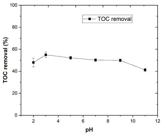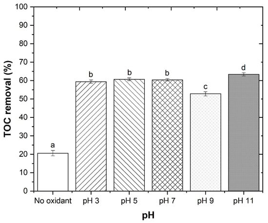 Evolution of TOC removal at different pH (3.0–11.0) in thermocatalytic oxidation, under the following operational conditions: /H2O2 ratio = 1:0.25, /H2O2 dosage = 0.1:0.025 (g/g), T = 333 K, agitation 350 rpm, t = 2 h. A blank experiment under the following operational conditions is also shown as reference: pH = 11.0, T = 333 K, agitation 350 rpm, t = 2 h. Means in bars with different letters represent significant differences (p < 0.05) between each pH.