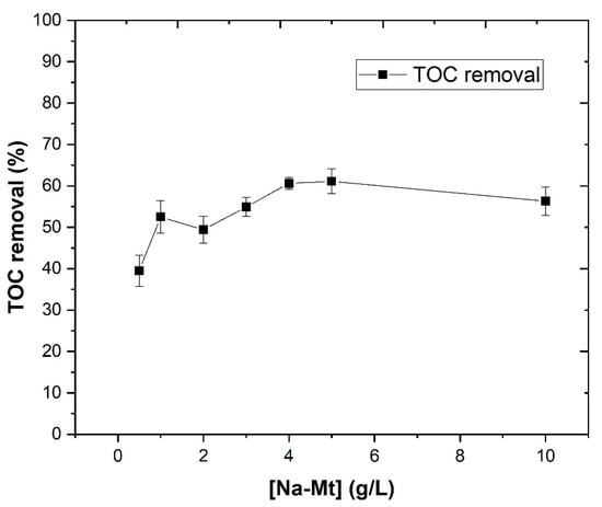 In Figure 4, it was observed an increase in TOC removal, with the increase in Na-Mt dosage from 0.5 to 5.0 g/L (39.5 to 61.1%, respectively). From 5.0 to 10.0 g/L Na-Mt, a small decrease in TOC removal was observed from 61.1 to 56.3%, respectively. Therefore, the application of Na-Mt dosages higher than 5.0 g/L were not considered viable, due to the low TOC removal results, as well as from an economic point of view, due to high Na-Mt application. In the work of Guimarães et al. [] and Jorge et al. [] it was also observed that application of clay concentrations higher than 3.0 g/L were not suitable for adsorption process of organic matter of WW.