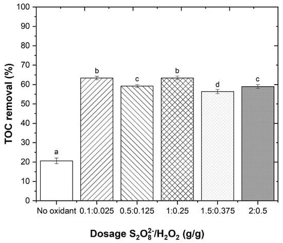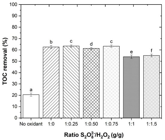 Evolution of TOC removal throughout different /H2O2 ratio (1:0–1:1.5) in thermocatalytic oxidation, under the following operational conditions: [] = 1.0 g/L, pH = 11.0, T = 333 K, agitation 350 rpm, t = 2 h. A blank experiment under the following operational conditions is also shown as reference: pH = 11.0, T = 333 K, agitation 350 rpm, t = 2 h. Means in bars with different letters represent significant differences (p < 0.05) between each ratio.