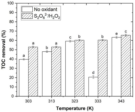 Therefore, in this section the effect of temperature variation (303, 313, 323, 333 and 343 K) was studied under the following operational conditions: /H2O2 ratio = 1:0.25, /H2O2 dosage = 0.1:0.025 (g/g), pH = 7.0, agitation 350 rpm, t = 2 h. Initial blank experiments were performed without addition of oxidant (Figure 8) and a TOC removal of 39.7, 48.0, 59.2, 20.6 and 63.4%, respectively, was observed. With the increase in temperature, an increase in TOC removal was observed, which indicated that there were organic compounds susceptible to heat. When oxidant agents (/H2O2) were added, an increase in TOC removal to 52.9, 53.0, 60.2, 60.4 and 65.6%, respectively, was observed. These results were similar to the work of Rodríguez-Chueca et al. [], who observed that when increasing the temperature, the efficiency of oxidation reaction of sulfate radicals increased in COD removal of WW. In the work of Zrinyi and Pham [], it was observed that phenol degradation by sulfate radicals was more efficient at 343 K, which is in agreement with this work.