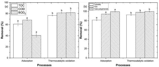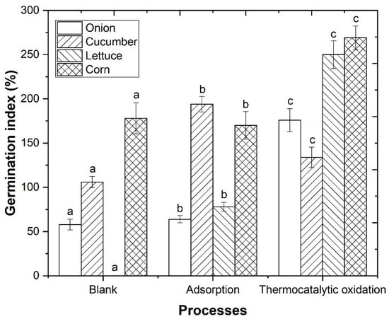 - The combination of adsorption–thermocatalytic oxidation processes allows efficient WW treatment with a TOC, COD and BOD5 removal of 76.7, 81.4 and 81.7%, respectively; It is also concluded that the combination of these two processes poses no phytotoxic effect in the germination of seeds due to high germination index (GI > 80%) observed in germination of onion, cucumber, lettuce and corn seeds;