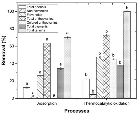 - Guimarães, V.; Lucas, M.S.; Peres, J.A. Combination of Adsorption and Heterogeneous Photo-Fenton Processes for the Treatment of Winery Wastewater. Environ. Sci. Pollut. Res. 2019, 26, 31000–31013. [Google Scholar] [CrossRef]