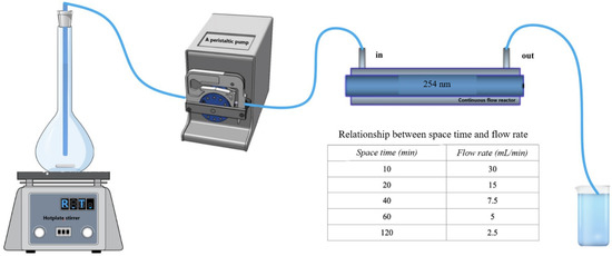 The experiments on the degradation of 4-t-BP were carried out in a 300 mL photoreactor equipped with a 10W UV lamp (Figure 1). The reactor was cylindrical with an external diameter of 50.8 mm and a length of 90 mm. Inlet flow rates ranged from 2.5 to 30 mL/min with the help of a peristaltic pump (Ismatec REGLO pump; IDEX Corporation, Lake Forrest, IL, USA). Ambient conditions of temperature and pressure were used, and approximately neutral pH conditions (6.7–7.1). Then, 15 mL aliquots of the treated solution were taken at different space times (10; 20; 40; 60 and 120 min) and filtered by means of 0.22 μm nylon filters. Each experiment was carried out in duplicates.