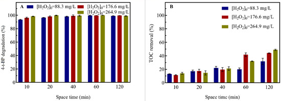 Subsequently, the UV/H2O2 process’ efficiency was examined by varying the initial concentration of hydrogen peroxide (88.3 mg/L, 176.6 mg/L and 264 mg/L) and space time values (10, 20 40, 60 and 120 min). The results obtained are shown in Figure 3 and agree with previous studies [12,21]. The UV/H2O2 process proceeds via direct photolysis and the formation of ∙OH radicals that decompose most organic compounds without discrimination. Specifically, 93.34% of 4-t-BP degradation was observed after 10 min. This is due to the formation of sufficient amounts of hydroxyl radicals via the decomposition of H2O2 [44,45].