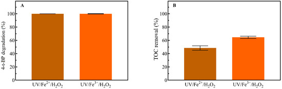 Figure 4A shows a similar oxidation performance for Fe2+/UV/H2O2 towards 4-t-BP degradation as in UV/H2O2 after 60 min of irradiation. The efficiency of Fe3+/UV/H2O2 was slightly lower. In contrast, an enhanced TOC removal (Figure 4B) was observed for the Fe3+/UV/H2O2 process, indicating a favorable Fe3+ contribution to the catalytic decomposition of H2O2 [52]. This can be attributed to a synergistic effect between Fe3+, UV and H2O2. TOC removal efficiencies followed the following order: Fe3+/UV/H2O2 > Fe2+/UV/H2O2 > UV/H2O2.