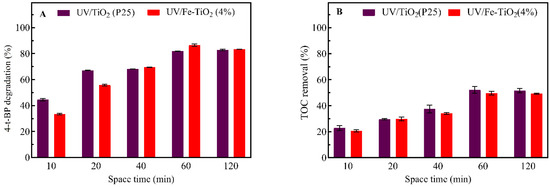 As shown in Figure 5, 4-t-BP and TOC removals were apparently increased with an increasing space time from 10 min to 60 min for both TiO2 and Fe-TiO2, indicating substantial impact of space time on the performance of the systems. However, increasing space time from 60 min to 120 min resulted in apparently lower 4-t-BP degradation and TOC removal. Compared to pure TiO2, the incorporation of iron particles slightly induced the degradation of 4-t-BP, degrading 87% after 60 min instead of 82%. This can be attributed to the retardation of the electron-hole pairs recombination [62]. It is noteworthy to mention that at lower space time (10 and 20 min), the performance of TiO2 exceeded Fe-TiO2, reaching 44.48% and 67% of 4-t-BP degradation in comparison to 33.41% and 55.79%, respectively. Comparatively, further increases in space time to 40 min and 60 min resulted in surpassed catalytic activity of Fe-TiO2 over TiO2.