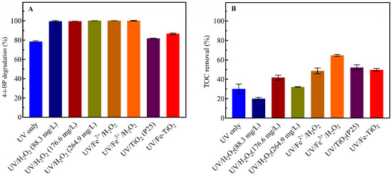 In order to compare the performance of UV-based processes, 4-t-BP degradation and TOC removal were plotted at the space time of 60 min. As observed in Figure 6A, the highest 4-t-BP degradation was achieved in the presence of H2O2 with the values ranging from 99.45% to 100% and followed the order of UV/H2O2 (264.9 mg/L) ≈ UV/Fe2+/H2O2 > UV/Fe3+/H2O2 > UV/H2O2 (176.6 mg/L) > UV/H2O2 (88.3 mg/L) > UV/Fe-TiO2 > UV/TiO2 > UV only. Since the addition of H2O2 yield in a formation of higher amounts of hydroxyl radicals, the observed enhancement was expected. On the other hand, H2O2 concentration increase in UV/H2O2 system had an almost negligible effect on the degradation. As for the heterogeneous AOPs, the removal efficiency of 4-t-BP was 81.8% and 86.5% with TiO2 and Fe-TiO2 in the concentration of 200 mg/L, which indicates slight increased degradation of 4-t-BP than that of UV treatment only. It is worth mentioning that combination of continuous flow and UV/Fe-TiO2 process contributed to the improvement of photo-oxidation reaction, while in a similar study [21] under batch-operated mode, the removal of 4-t-BP was higher by means of commercial TiO2 than that of Fe-TiO2.