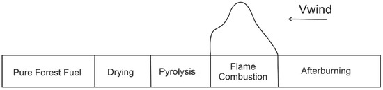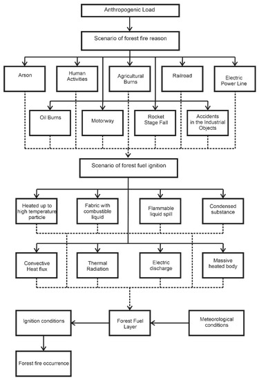 To ensure the normal further functioning of biogeocenoses and the entire planet, it is necessary to conduct research in terms of forest fire fighting. Wildfires are already becoming commonplace in forested countries around the world [1,2,3,4]. Every forest fire brings with it significant losses of various types: human, economic, forest resources reduction, and biogeocenoses destruction [5,6,7]. Many research groups worldwide are working on developing various schemes for monitoring and extinguishing forest fires, and conducting mathematical and physical experiments to study the influence of external conditions and the type of forest on the firing process. The data obtained have already been used to combat natural disasters [8,9,10,11]. However, further research is necessary to summarize the already known data on the topic and fill the existing “niches” in this area. Only after receiving a complete picture of the forest fires features, will it be possible to resist them effectively. To accurately predict the occurrence of forest fire and further spread, it is necessary to generalize knowledge about the processes happening during a fire. The following sequence of phases stands out [12]: 1. Forest fuel heating and drying with the water vapor release; 2. Drying and beginning of combustion, where the water vapor and resins are released; 3. Ignition of gases and flaming combustion, followed by the water vapor, smoke, carbon dioxide release; 4. Carbonization and coal afterburning.