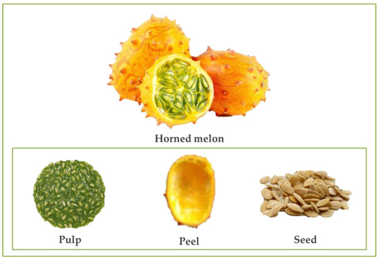 The origin of horned melon is common to the cucumber family and refers to Africa, above all Nigeria. Today it is grown in Australia, Kenya, Israel, California, Chile, and New Zealand. The fruit is ellipsoidal-shaped, with an average length of about 12 cm and a diameter of about 8 cm. The color of the horned melon changes during maturing from green to orange with green stripes. The surface of the horned melon fruit contains conical protrusions with thorns, which can be easily removed when the fruit matures. Inside, the pulp is a juicy green slimy mass with numerous smooth white seeds. Seeds are white, about 5 to 9 mm long, edible, ellipsoid, flattened, and there are hundreds per fruit [7,9]. The main parts of the horned melon are presented in Figure 1.