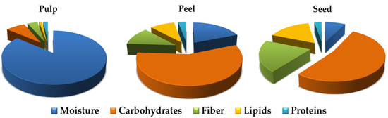 Figure 2 shows that fresh horned melon pulp has a high-water content (89–96.0 g/100 g) and low levels of calories (22–44 kcal/100 g), carbohydrates (7.56 g/100 g), fiber (4–4.20 g/100 g), lipids (0.03–1.26 g/100 g), and proteins (1.78–1.80 g/100 g) [12]. The pulp also contains a high vitamins content; high concentrations were noted for complex B vitamins and vitamin C, while a lower concentration was determined for vitamin A [12] (Table 2). In contrast, Rowero-Rodriguez [13] and Ferrera et al. [6] detected significantly lower values for vitamin C content. Several researchers suggested that horned melon pulp also stands out for its mineral content, particularly for potassium, phosphorus, magnesium, calcium, iron, sodium, zinc, and copper [6,12,13].