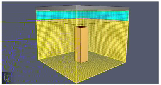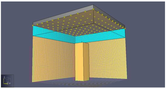 This simulation adopts multigrid division, and according to the principle of grid division of FDS software, the simulation space size is set to 0.2 m × 0.2 m × 0.16 m. For the overall space, a grid size of 4 mm in length, width, and height is selected. The total number of cells is 100,000 after partitioning is completed. After several simulation tests, the grid size meets the simulation requirements. The heating gun heating model is established at the center of the overall space, and the mold model is established at the top of the space. According to the above grid division principles, grid division is carried out, and the grid is divided as shown in Figure 3.