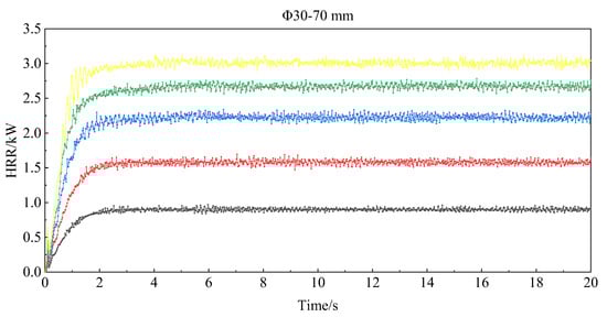 As seen in Figure 6, the HRR curves stabilized after 4 s for all diameter heating guns. Although the heat release rate value exhibits certain fluctuations, always around a certain value change, combustion tends to stabilize. The steady-state heat release rate values for the Φ30 mm, Φ40 mm, Φ50 mm, Φ60 mm, and Φ70 mm heat guns were 0.9 kW, 1.6 kW, 2.2 kW, 2.7 kW, and 3.0 kW, respectively.