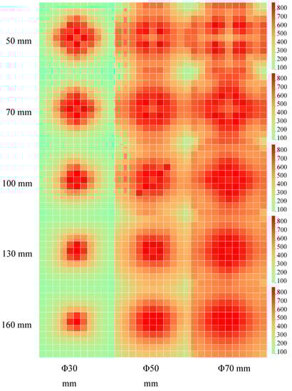 Collating the results of the temperature probe detection showed that the mold surface temperature leveled off after 15 s. The temperature probe value at 20 s was taken to draw a temperature heatmap to analyze the temperature distribution on the lower surface of the mold. By analyzing and filtering the heatmap for each distance of each diameter, the heatmaps for each distance of 30 mm–, 50 mm–, and 70 mm–diameter heating guns were selected, as shown in Figure 8.