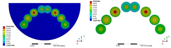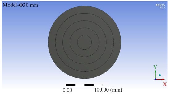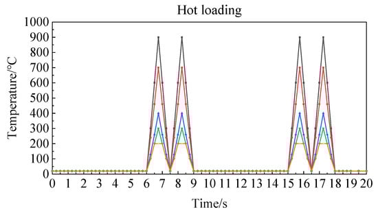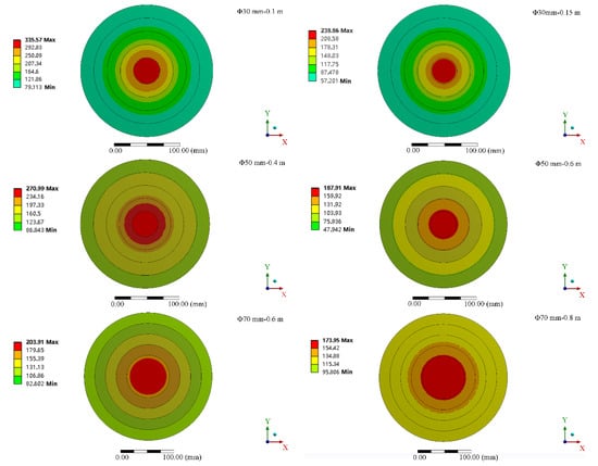 According to Section 3.3.2, 30 mm–0.15 m, 50 mm–0.4 m, 70 mm–0.6 m, and 70 mm–0.8 m heat-affected die heat loading cases were obtained and different temperatures were loaded onto different diameter rings or circles. The end-face die heat loading cases are shown in Figure 17.