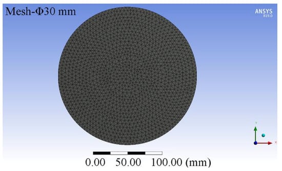 Taking the 30 mm heating gun as an example, in this simulation, the tetrahedral meshing method was chosen for each model as a whole, and the mesh size was divided by a 5 mm mesh through multiple simulations. The mold after the mesh division was completed as shown in Figure 10. As shown in Figure 10, after the model meshing was completed, the total number of nodes was 41,131, and the total number of cells was 24,075.