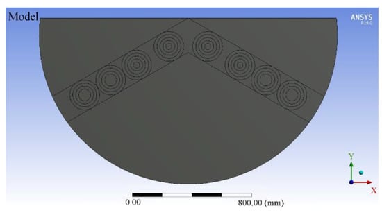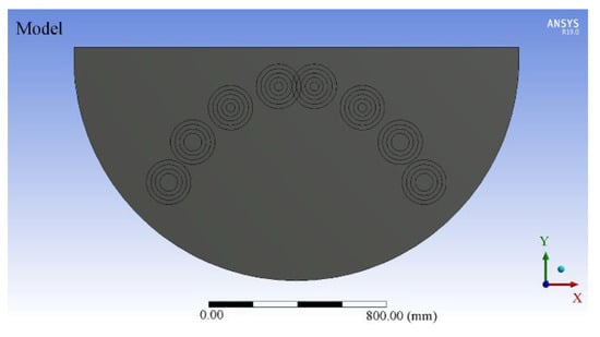 The ANSYS heating simulation model is established in Figure 19, and the completed ANSYS model after construction is shown in Figure 20. The diameter of the end die is D2 = 2.0 m and the thickness is δ2 = 10 mm; the material is domestic steel Q235A. The 30 mm, 50 mm, and 70 mm heat-affected molds were installed on the end-face molds sequentially according to the distribution of the heating gun end faces in Figure 19. The mold structure and its physical parameters for the end-face mold and heat-affected mold are consistent with Table 2.