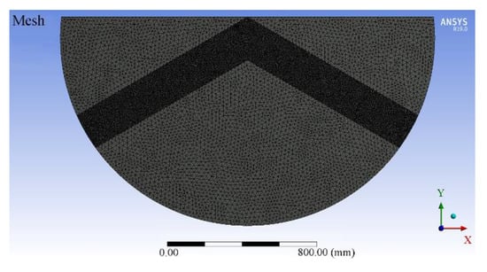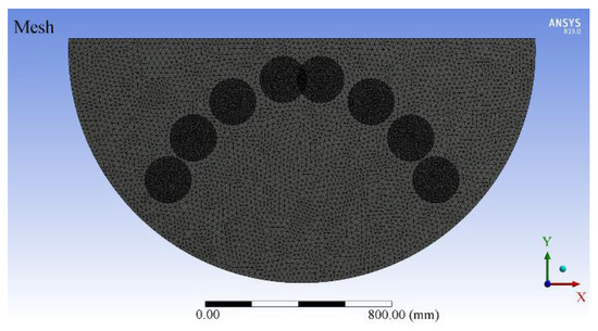 In this simulation, the tetrahedral meshing method was chosen for the model as a whole, and the cell mesh size was set to 20 mm for the whole area of the end-face mold. For the heat-affected mold, the cell mesh size of the selected area was set to 5 mm. After the model meshing was completed, as shown in Figure 21, the total number of nodes was 375,261, and the total number of cells was 215,720.