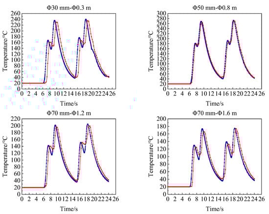 Theoretical and experimental temperature–time curves. Blue: theoretical curves, red: experimental curves.