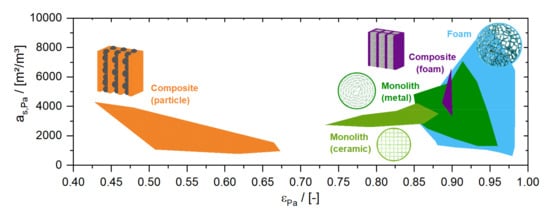 Beginning in 2003, open-celled foam structures have become more and more the focus of research due to their extremely high porosity and surface area [24,30]. Furthermore, such structures also provoke a radial transfer of matter which is not present in monolithic packings, making them less sensitive to initial liquid distribution. However, an efficient and reliable method to deposit industrial catalysts is still a central challenge in the application of these novel catalyst structures. An alternative could be the integration of industrial catalyst particles into structures which guide the flow in so-called composite structured catalysts [31,32,33]. Particles, pellets, extrudates and even foams are suggested as internals.