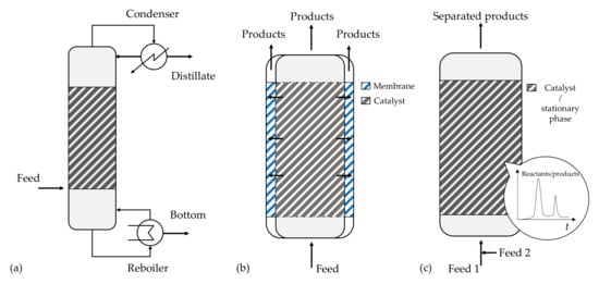 Sketch of multifunctional reactor units: (a) reactive distillation column; (b) membrane reactor; (c) chromatographic reactor.