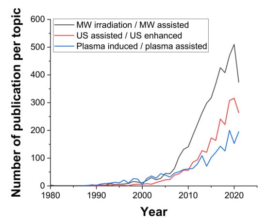 There are several different types of irradiation which can be used for process intensification due to their ability to produce intense localized heating, turbulence, and chemical effects [58]. Here, we will briefly describe the most popular types, namely, microwave, ultrasound, and plasma irradiation, and highlight some of the most recent scientific progress using these techniques in the context of chemical engineering. As seen in Figure 6, among these three technologies, using microwaves to enhance chemical systems has been the most commonly reported in scientific research, with an annual output on this topic of over 500 publications in the chemical engineering field at present.