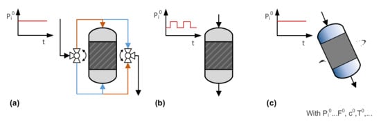 In dynamic operation modes, process parameters such as flow direction, flow rate, concentration, temperature, and pressure are periodically modulated, which may be achieved by (for example) flow reversal, modulation of inlet parameters, and movement of the reactor, as illustrated in Figure 7. It must be mentioned that there are many other strategies for benefiting from process dynamics, such as in discontinuously operated reactors, apparatuses combining reaction and separation (e.g., chromatographic, membrane or swing reactors), and systems with oscillating reactions, which will not be addressed here. Important characteristics of the dynamics include (a) the period , defining the time between the repetitions of changes; (b) the split , giving the duration ratio of a partial cycle; and (c) the amplitude , describing the intensity of the change. These additional degrees of freedom provide further tuning parameters for process optimization. On the other hand, identification of favorable operation modes and reliable comparison with steady-state modes is very challenging, and usually requires extensive reactor simulation.