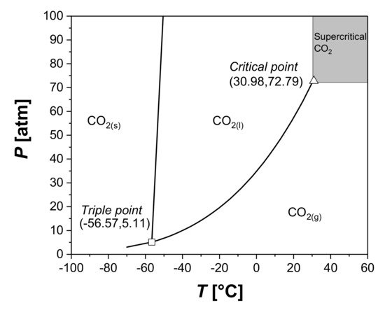Another interesting alternative is represented by the supercritical fluids (Figure 8). A fluid is said to be supercritical when its temperature and pressure overcome the critical temperature and pressure. Supercritical fluids are characterized by intermediate properties between gases and liquids. They show a density similar to liquids with a viscosity and diffusivity similar to gases, and these properties can be modified by varying pressure and temperature [118].