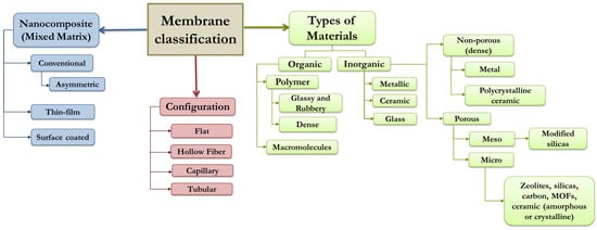 Ideally, membrane materials for gas separation should exhibit a high selectivity and big fluxes, excellent chemical, mechanical and thermal stability, a defect-free production and be cost effective. Membranes are classified according to the type of material, configuration, structure, composition, support material and industrial reactions, among others (Figure 2) [35,36,37]. Four kinds of membranes are typically proposed for development and commercialization in hydrogen purification: (i) polymeric membranes (organic), (ii) porous membranes (ceramic, carbon, metal) (iii) dense metal membranes and (iv) ion conductive membranes, the last three also referred to as inorganic membranes [27]. In this context, dense-metal membranes and polymeric have experienced the largest advances in terms of scale-up [38]. The most commonly used polymeric membranes for gas separation are nonporous membranes, which are classified as glassy or rubbery. Of them, glassy polymers are most typically used for gas separation applications. These polymers include polysulfones (PSF), polycarbonates (PC) and polyimides (PI), which are often employed for the separation of H2/CH4, H2/N2 and O2/N2 [39]. On the other hand, membranes can be configured as hollow fibers, capillaries, flat sheets and tubular and can be installed in a suitable membrane module. The most commonly used modules are pleated cartridges, tubular and capillary, hollow-fiber and plate-and-frame and spiral-wound systems [40].