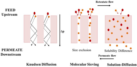 Schematic representation of the three mechanisms for gas mixture separation in membranes: diffusion—Knudsen diffusion, molecular sieving, and solution-diffusion. Orange circle (molecule A), Red circle (molecule B). The figure was adapted from Sridhar and co-workers, 2014, and Ismail and co-workers, 2015.
