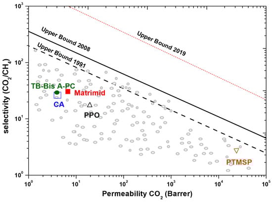 Swaidan reported in 2015 new permeability/selectivity “upper bounds” for commercial membrane modules for air and hydrogen separation (H2/N2, H2/CH4 and O2/N2) [63]. The Robeson upper bound behavior was redefined by Comesaña-Gandara in 2019 for CO2/N2 and CO2/CH4 separations using ultra-permeable Polymers of Intrinsic Microporosity (PIM) [64].