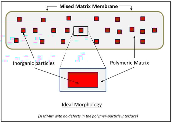The desired morphology of MMMs would include the absence of defects in the polymer–particle interface and must ensure gas transport across the dispersed phase instead through the continuous phase (polymeric matrix) (Figure 9) [101]. The advantages of morphology can be understood in terms of the ideal Maxwell model that represents the simplest case for mixed matrix transport properties [106]. This model, described by Robeson as a dilute suspension of particles in a polymeric matrix, was mainly developed for estimating dielectric properties of composites and describes the effective permeability of MMMs, as follows [107,108]: