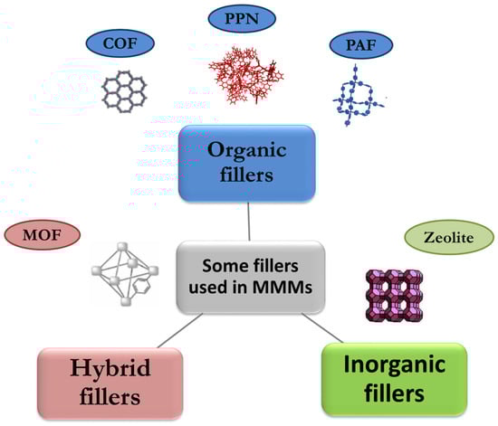 In this context, hybrid materials known as MMMs have been manufactured by adding inorganic materials as the disperse phase into polymers in order to take advantage of the processability of polymers and simultaneously overcome the trade-off between permeability and selectivity. The mixed matrix membranes concept has been described in multiple scientific publications. According to the most recent definitions, MMMs results from the combination of an inorganic or inorganic-organic hybrid material (micro or nanoparticles)—in the form of dispersed particles called additive or filler—and a polymeric matrix-continuous phase (Figure 8) [30,93]. PIMs and HPI are the most commonly used polymeric matrices, and zeolites the most common fillers. Moreover, MMMs have been recently thermally treated to obtain MMM-TR with outstanding gas transport properties for gas pairs such as CO2/CH4, O2/N2, H2/CO2, etc. [94,95,96,97,98].