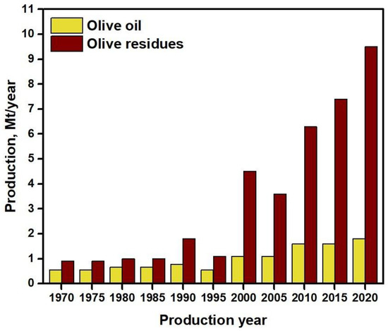 However, considering the cases of Spain and Greece, these two Mediterranean countries contributed only a relatively low portion in the EU total bioelectricity production in the year 2019, generating ca. 5.0 and 0.4 TWh, respectively [10]. This finding is somewhat oxymoronic, considering their rather high biomass utilization potential compared to most of the European Union countries. In particular, Greece generates a large amount of agricultural and agro-industrial residues, equal to approximately 23 Mtonnes, being the third largest olive oil industry worldwide, with an annual capacity of approximately 350 ktonnes of olive oil [11,12,13,14]. As a consequence, residues from the olive oil production industry constitute half of the total agricultural and agro-industrial residues (Figure 1). Similarly, Spain is the second largest olive oil industry with an average annual production of 1.4 Mtonnes of olive oil (Figure 2). It can be seen that a slight increase in olive oil production has been demonstrated in the latest years, which in turn is associated with a greater increase in the absolute amount of olive residues. This is a direct result of the olive oil extraction process itself, as described in the next paragraph. Also, as in Greece, olive residues represent a great share among other agro-industrial residues, with an annual quantity of ca. 9.5 Mtonnes (2020 data) [11].