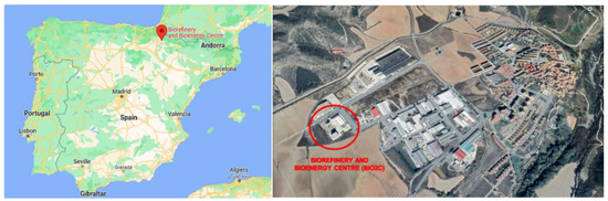 The gasification of olive kernels was conducted in the gasification unit at the Biorefinery and BioEnergy Centre (BIO2C) of the Spanish National Renewable Energy Centre (CENER) in Aoiz, Navarra, Spain. The exact location and a general overview of the plant can be seen in Figure 5 and Figure 6a, respectively. The unit is able to handle a wide range of operating parameters and a variety of biomass feed types and bed materials, as seen in Table 4. The designed nominal thermal power of the pilot plant is 2 MW, but is able to operate under nominal powers between 1.2–2.2 MWth with biomasses with a wide bulk density range covering an order of magnitude (i.e., between 80 and 800 kg/m3) and a moisture content of up to 30 wt.%.