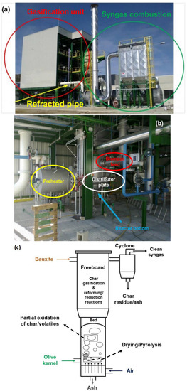 The bottom part of the BFB gasifier along with identification of the main parts is shown in Figure 6b, whereas its schematic representation is shown in Figure 6c. The air is blown upward through a distributor plate to keep the bed particles in a state of suspension [54]. The solid biomass fuel is introduced at the bottom of the reactor, just above the distributor plate, and is rapidly mixed with the bed material, followed by intensified mass and heat transfer. The overall gasification takes place in three linked zones. Initially, drying of olive kernels upon heat exposure leads to moisture evaporation. Subsequently, the devolatilization process involving a series of complex reactions takes place, thus generating char, tars, light gases (H2, CO, CO2, CH4, H2O), and other heavier hydrocarbons. The produced char, tar as well as H2 and CO are then partially oxidized, a process that releases a large amount of heat that could be used to sustain the thermally-intensive and endothermic gasification reactions. Finally, in the freeboard zone, the products of partial combustion and uncombusted cracked pyrolysis products (volatiles, char) now pass to the freeboard/dilute/reduction zone where the reduction reactions take place [27]. Further gasification and/or reforming reactions (Boudouard reaction, water-gas shift reaction, etc.) occur, resulting in syngas generation.