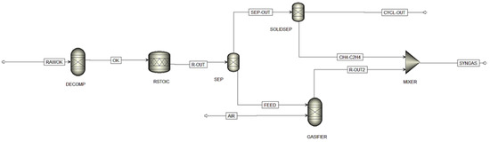 The general model used for the process simulation was based on the procedure followed by Grimekis et al. [55,56] as well as the general considerations reported in the review by Ajorloo et al. [32]., and is illustrated in Figure 7. Specifically, the raw biomass (RAWOK) is initially decomposed in an RYield block, where it is converted from a non-conventional solid to its constituent conventional compounds (i.e., C, H2, N2, S, O2, and H2O) as well as ash, according to the ultimate analysis of the solid (stream OK). In particular, ash was considered a non-conventional substance, char and solid carbon were both modelled as graphitic carbon, while all other compounds were considered as conventional compounds from the Aspen Plus database. Typically, for the proper definition of biomass, HCOALGEN and DCOALIGT models were employed for the calculations of enthalpy and density, respectively and Peng-Robinson was selected as the method for thermophysical properties calculation.