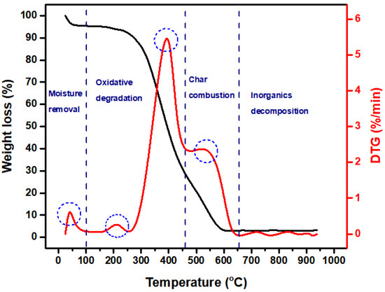 In the first zone, the initial weight loss (ca. 5%) was typically ascribed to moisture evaporation at an onset temperature of 30 °C until ~110 °C. Moreover, the peaks in the second zone between 150 and 460 °C were attributed to devolatilization reactions. During this stage, a high weight loss of ca. 70% was observed, evidencing the predominance of oxidative decomposition of the volatile matter contained in the olive kernel fuel. Specifically, the main peak at around 400 °C was a direct result of the highest weight loss rate (5.7%/min) and was associated with the chemical decomposition of cellulose and lignin, while the smaller peak at around 220 °C was ascribed to both the release of residual moisture from the bulk of the solid and the decomposition of hemicellulose [27]. After the oxidative degradation and the release of volatiles, the next zone contained the combustion of char, resulting in an additional mass loss of ca. 20% (see Figure 8). Finally, two small peaks were observed at relatively high temperatures, attributed to the decomposition of the inorganic matter, the low intensity of which is in agreement with the low ash content of olive kernels.