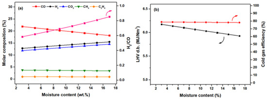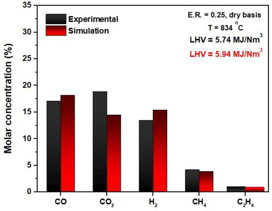 Also, the lower heating value of the produced syngas was found to be similar to the experimental value (i.e., ~5.94 MJ/Nm3,), further showcasing the good agreement between the experimental and simulation results.