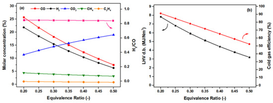 The oxidative gasifying agent, which acts also as a fluidizing agent, is the driving force which can transfer a solid carbon species into the gaseous phase, as biomass carrying oxygen and hydrogen is not sufficient for the partial oxidation of char and volatiles. In some cases, an over-stoichiometric amount of air is supplied in the reactor in order to shift the equilibrium of the oxidation reactions towards oxygen consumption. In this way, the high exothermicity of the involved reactions releases significant amounts of heat that can be utilized by the system in order to reach and maintain the high temperatures required for the endothermic reforming and gasification reactions. In practice, typical equivalence ratio (ER) values reported in the literature for BFB reactors [38,40,42] are between 0.2 and 0.4. A higher ER value is inevitably associated with an increased N2 dilution of the generated syngas, due to the increased air influx and in turn the heating value of the final gas being lowered. Ergo, a balance between the need for heat generation for the endothermic reactions induced by increased air flow and the detrimental effect of increased N2 content in the heating value must almost always be attained.
