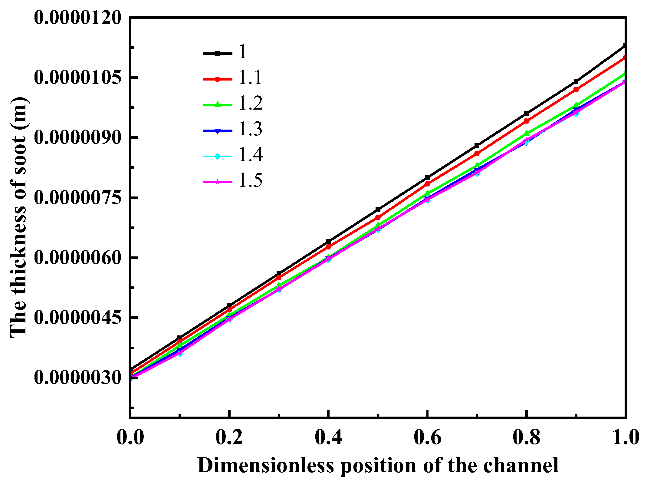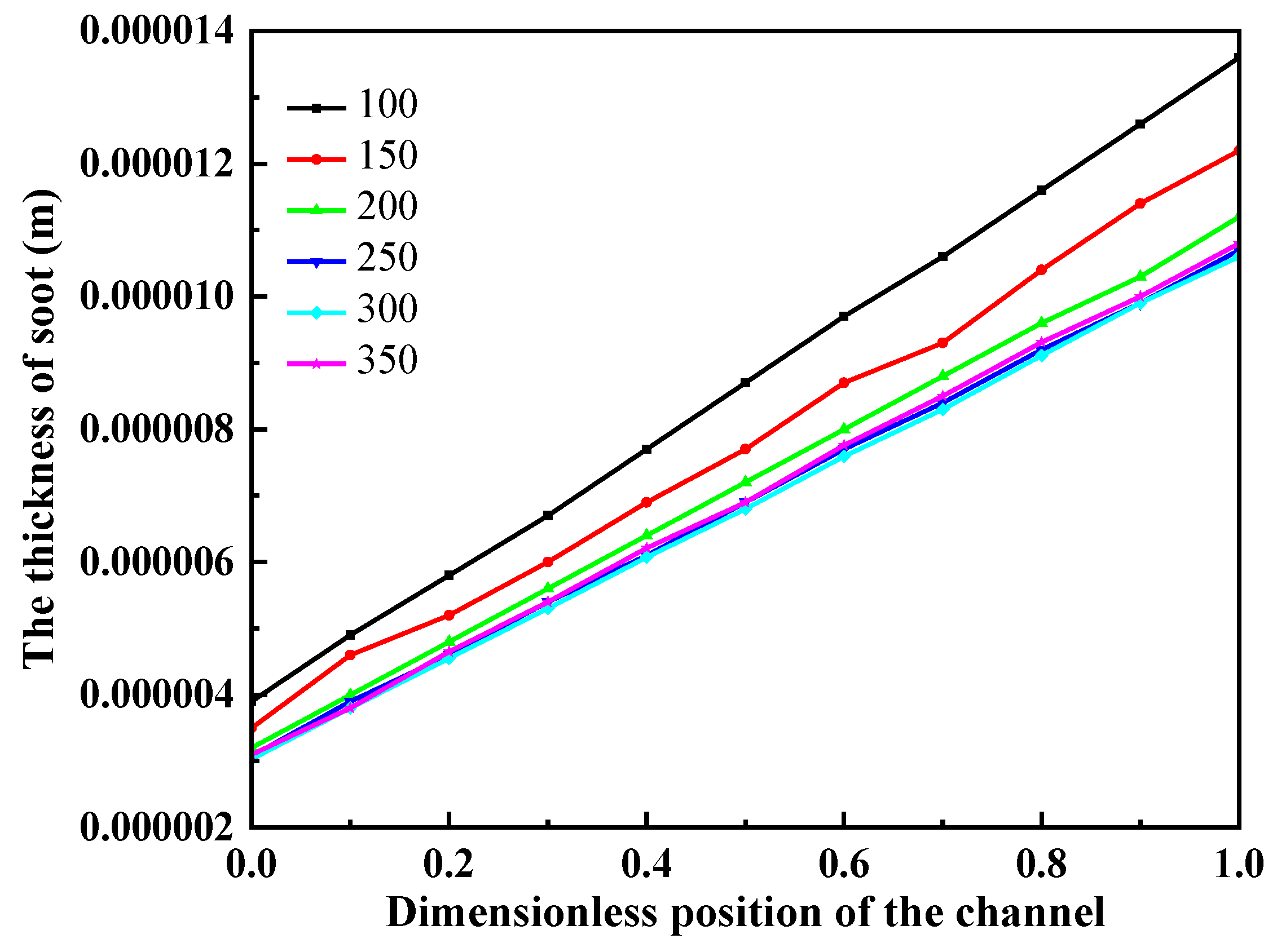 4.5. Effect of the Ratio of Inlet and Outlet Channel on the Distribution of Soot