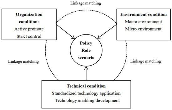 The development of the online ride-hailing industry and the formulation of related policies are comprehensively influenced by information technology, market tolerance, and the development environment of online ride-hailing. Therefore, this study took the TOE scenario feature as the Z analysis dimension and depicted the impact of the current online ride-hailing policy within the context of different scenario-based dimensions. The TOE framework was proposed by Louis G. Tornatizky and Mitchell Fleischer in 1990, and was first applied to analyze the influencing factors for the adoption of new technologies [33]. Later, this framework was widely used in research on the adoption and implementation process of new strategies, new policies, and new business models, with strong systematization, flexibility, and operability. The model focuses on the action mechanism of the multilevel technology application scenario, with respect to the technical realization effect. Examples include the specific application scenario of technology, the degree of organizational demand for technology, and the application degree of technology and the organizational framework [34]. Technical conditions refer to the characteristics of the technology itself and its relationship with the organization. It mainly depends on whether the technology matches the structural characteristics of the organization, whether it is coordinated with the application ability of the organization, whether it is compatible with the application ability of the organization, and whether it can bring benefits to the organization, or potential benefits [35]. The influence of organizational conditions on the application of technology mainly includes the organizational scale, business scope, formal or informal institutional arrangements, communication mechanisms, and idle resources of reserve savings [36]. Environmental conditions include the market structure of the organization and the external control policies of governments [37]. From the perspective of technical conditions, in order to improve the positive role of information technology in the development of the car-hailing industry, the policies issued can be divided into two major technical scenarios: standardized technology application; and technology empowerment development. The organizational situation can be understood as the central government’s emphasis on the car-hailing industry and its attitude towards the development of the industry. Therefore, organizational conditions can be divided into two scenarios: active promotion; and strict control. Environmental conditions can be analyzed from both macro and micro dimensions. First, the macro environment includes the influence of the government’s overall goal of promoting economic development and maintaining social stability, which can be understood as the background for the introduction of the car-hailing policy. Second, the micro environment refers to the citizens’ needs for travel, employment, and social security, as well as the practical needs of enterprise development and innovation for supporting policies. Overall, the TOE framework provides six different scenarios based on the three first-level conditions, which helps us to further understand policy style regarding online ride-hailing in China from the perspective of scenario feature, which is composed of technology, organization, and environment (as shown in Figure 1).