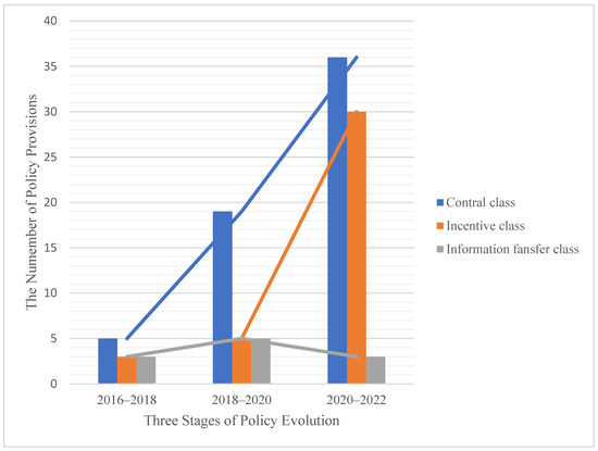 To further analyze ride-hailing policy styles at different stages of development, it is helpful to incorporate the time factor into the analysis of different policy instruments. Based on the previous analysis, we took the promulgation of two documents entitled the “Guiding Opinions of The General Office of the State Council on Deepening the Reform and Promoting the Healthy Development of the Taxi Industry” and “Urgent Notice on Further Strengthening the Safety Management of Online Taxi Reservation and Private Passenger Cars”, and the COVID-19 outbreak as the time nodes, to classify policy development from 2016 to 2022 into three stages. Figure 4 illustrates the different combinations of policy instrument types and their evolution at different stages of development. From 2016 to 2018, the number of policy instruments was relatively small for each of the three categories, and the legal status of online ride-hailing had just been granted, which means that it was in the initial stage of development. At this stage, the government mainly promoted the development of the car-hailing industry by giving full play to the autonomy and power of the market. Instead, overall plans were communicated to outline the development direction of online ride-hailing. In 2018–2020, the number of control policy instruments increased significantly. Because for one thing, increasingly more negative passenger experiences have occurred in the online ride-hailing industry, and the personal safety of passengers has attracted the attention of the government and the public. On the other hand, after several years of free development, the online car-hailing industry has formed a solid market foundation and a monopoly position, which requires the government to introduce regulatory measures. From 2020 to 2022, while the number of regulatory policy instruments continued to increase, the number of incentive-based policies also showed an obvious growth trend and was six times greater than that of the previous stage. Against the backdrop of the seemingly unending COVID-19 epidemic, the global economy is continuing to experience tremendous downward pressure, and high unemployment has generated instability in several areas of society. Therefore, to address the issue of unemployment and promote the economy, the government has encouraged the online ride-hailing and food delivery industries to create more jobs, appealing to platform enterprises to protect the legitimate rights of workers. The “Opinions of the Ministry of Transport”, the Publicity Department of the CPC Central Committee, and the Cyberspace Administration of the CPC Central Committee on Strengthening the Protection of the Rights and Interests of Employees in New Forms of Transport, set forth detailed provisions on the protection system for the rights and interests of employees, as well as the employment environment. At the same time, based on the growing demand of the digital economy and green economy, the government has also increased its economic support for the car-hailing industry.