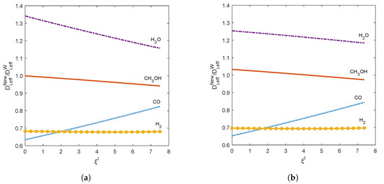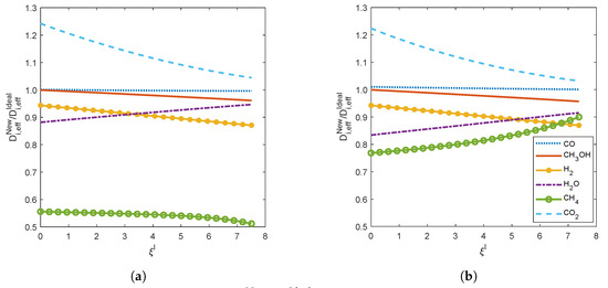 Effective diffusivities ratios from up to equilibrium () for an initial equimolar reactants mixture at 78 C: (a) , and (b) .